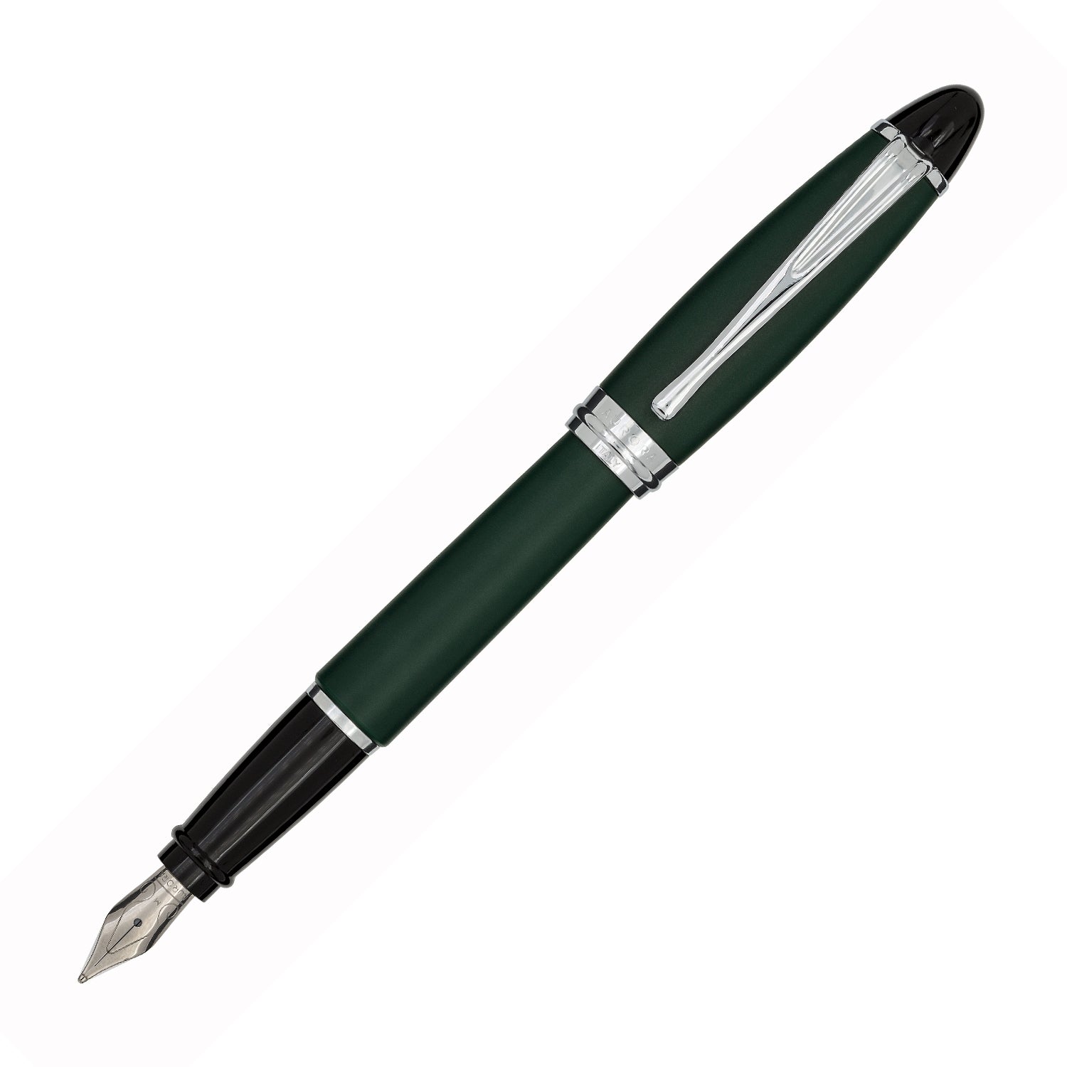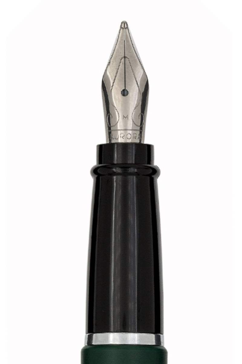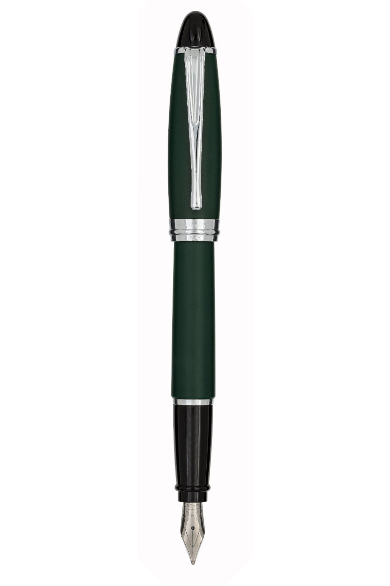 Ipsilon estilográfica, de cartucho o convertidor, en resina verde efecto satinado. Plumín de acero cromado.