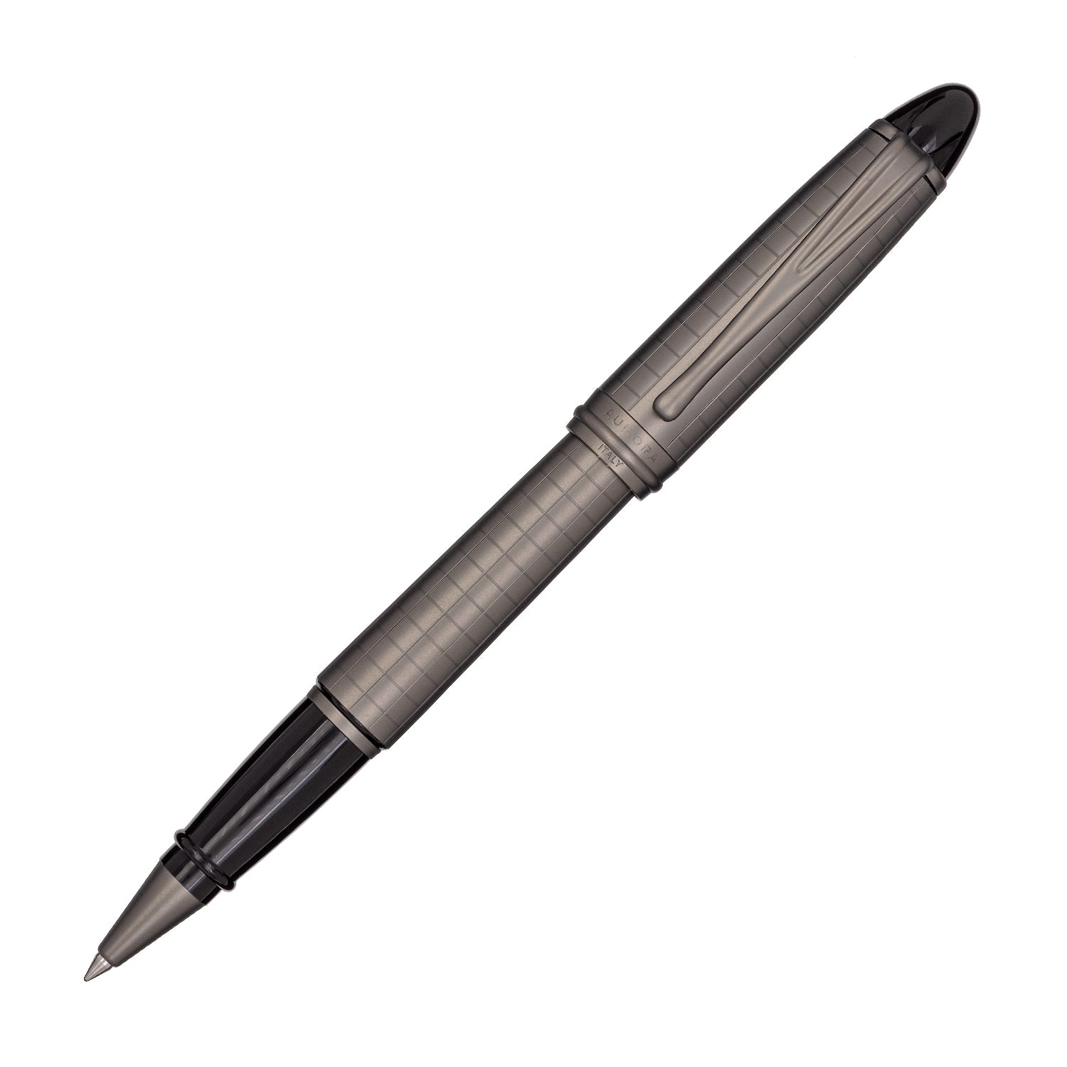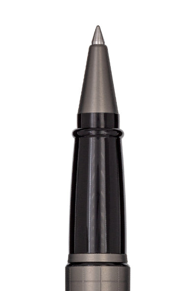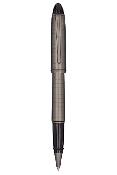La pluma tiene un capuchón y un cuerpo de rutenio negro satinado, adornado con un grabado guilloché de Quardra.