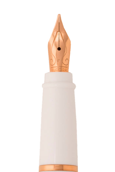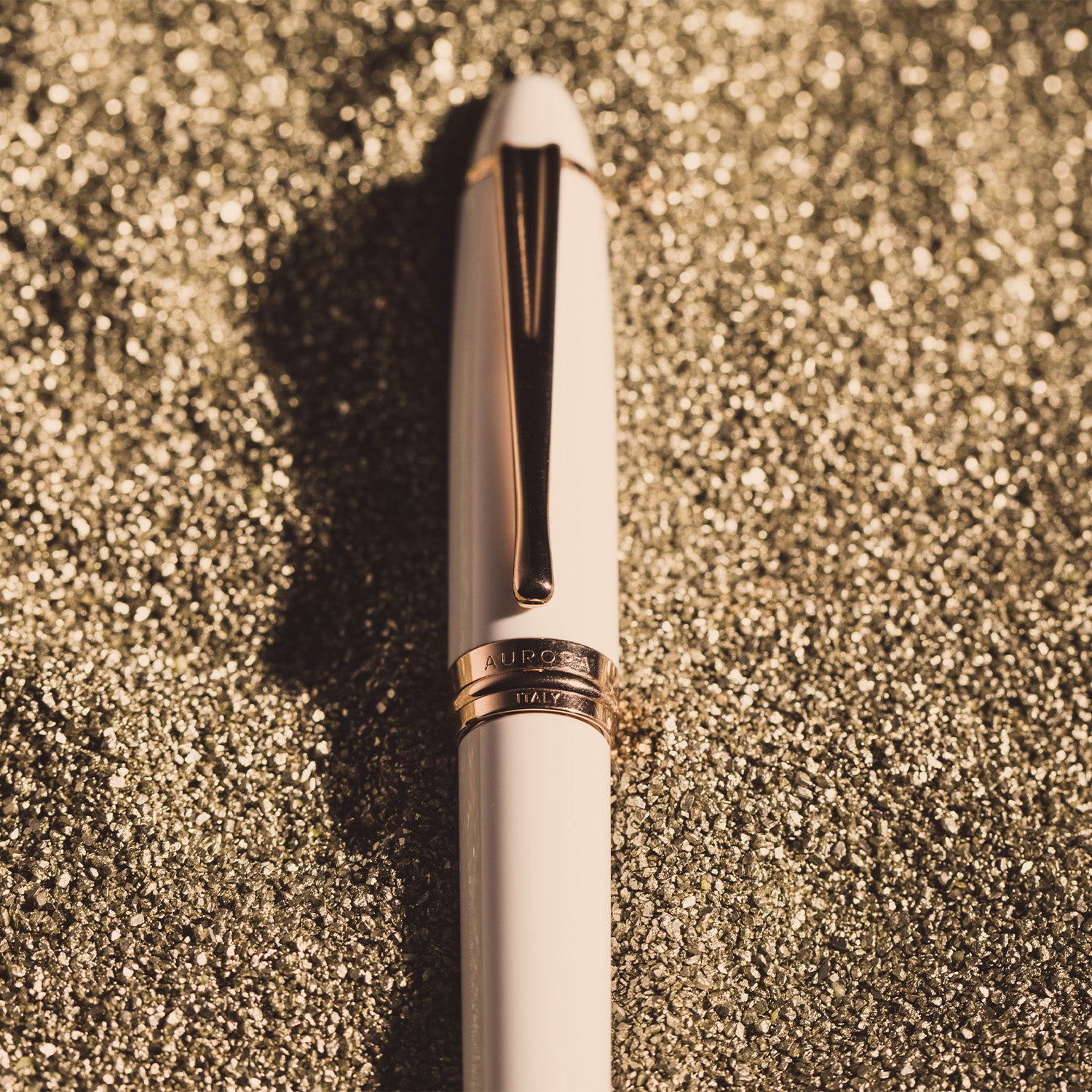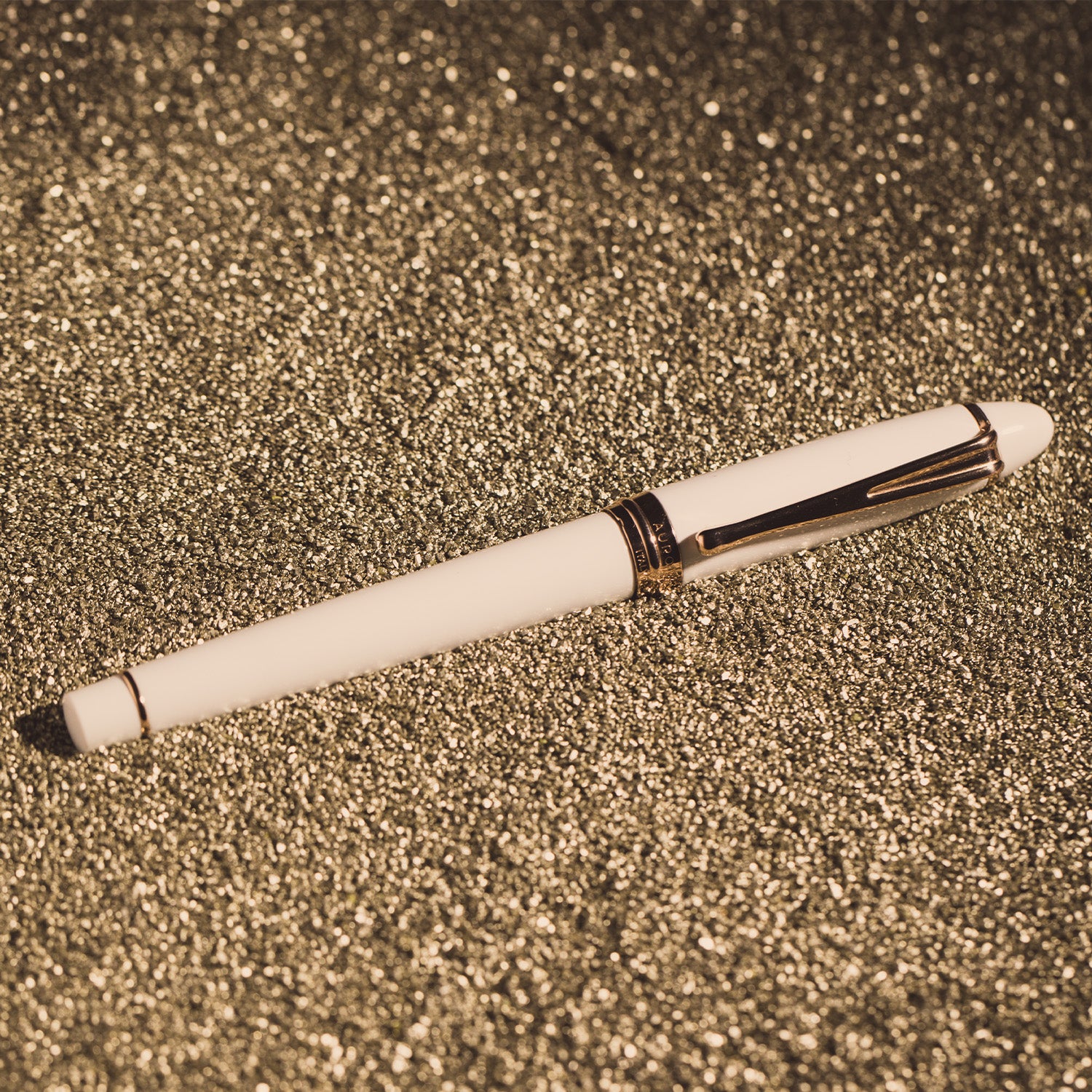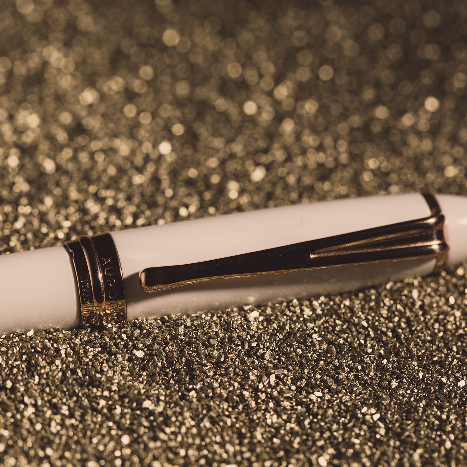 La pluma estilográfica Winter forma parte de la colección invierno; Está elaborada en resina blanca y decorada con detalles en oro rosa.