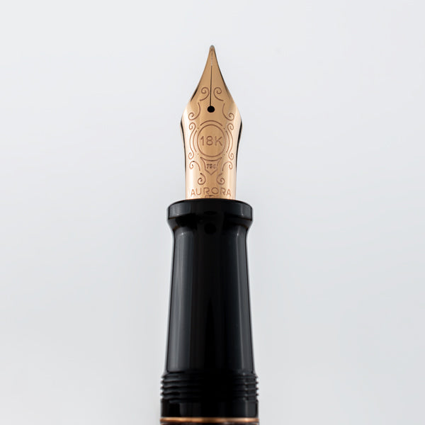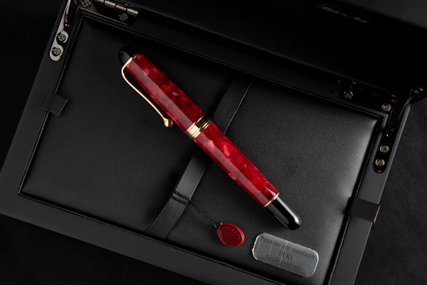AURORA celebra 70 años de la clásica Ottantotto con una edición especial, elaborado en mármol rojo decorada con detalles en oro rosa. Limitada a 888 piezas. Su distintivo plumín está elaborado en oro macizo de 18 Kt.