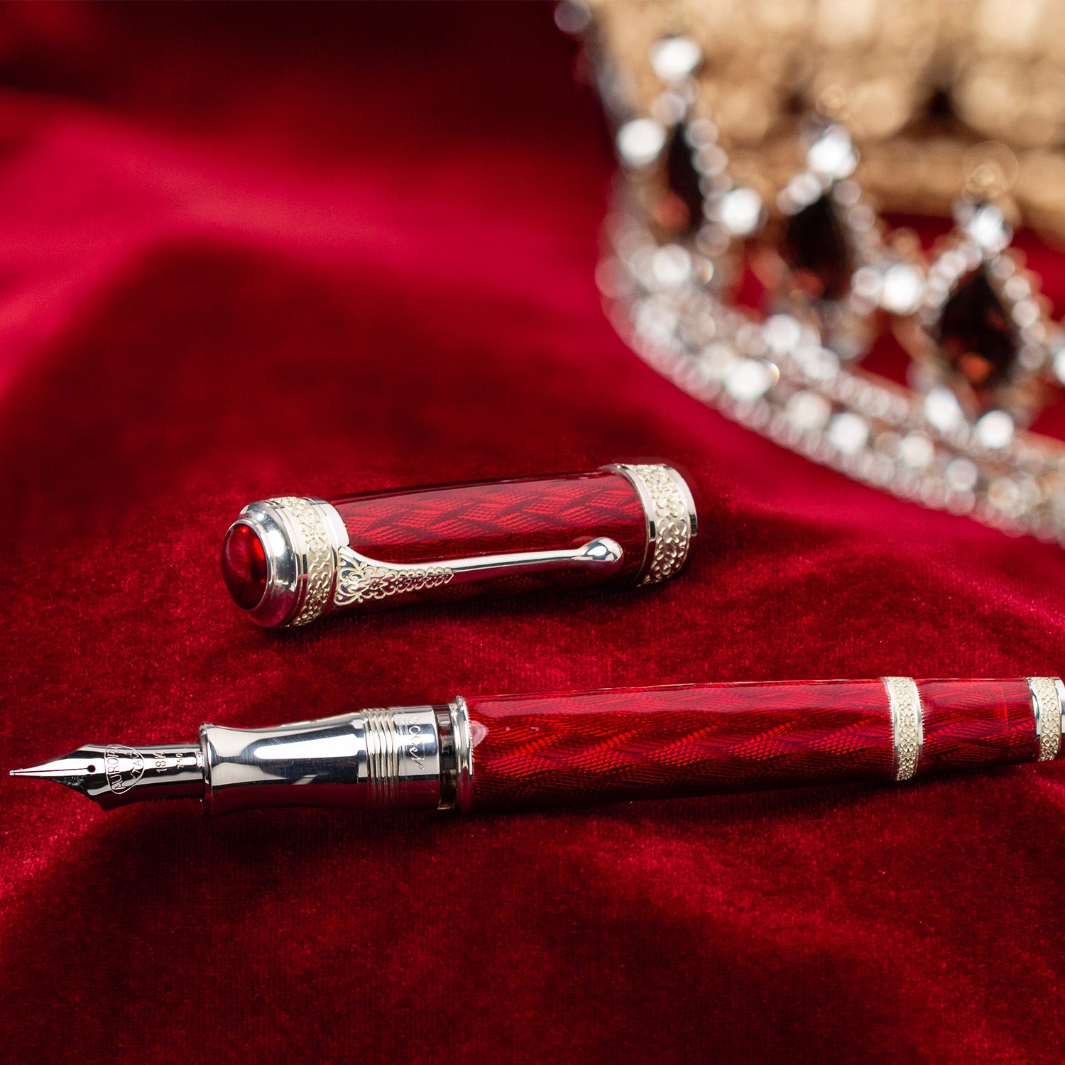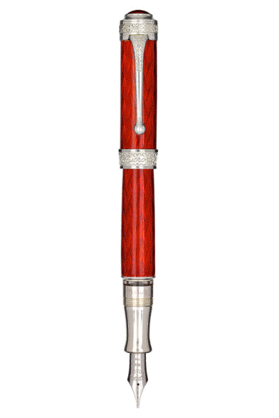 CENTO, pluma estilográfica en plata maciza .925 con un grabado guilloché “flamé”, capuchón y cuerpo en laca vidriada roja, adornos de plata maciza. 18kt. plumín de oro macizo tratado con rodio. Edición limitada de 919 piezas.