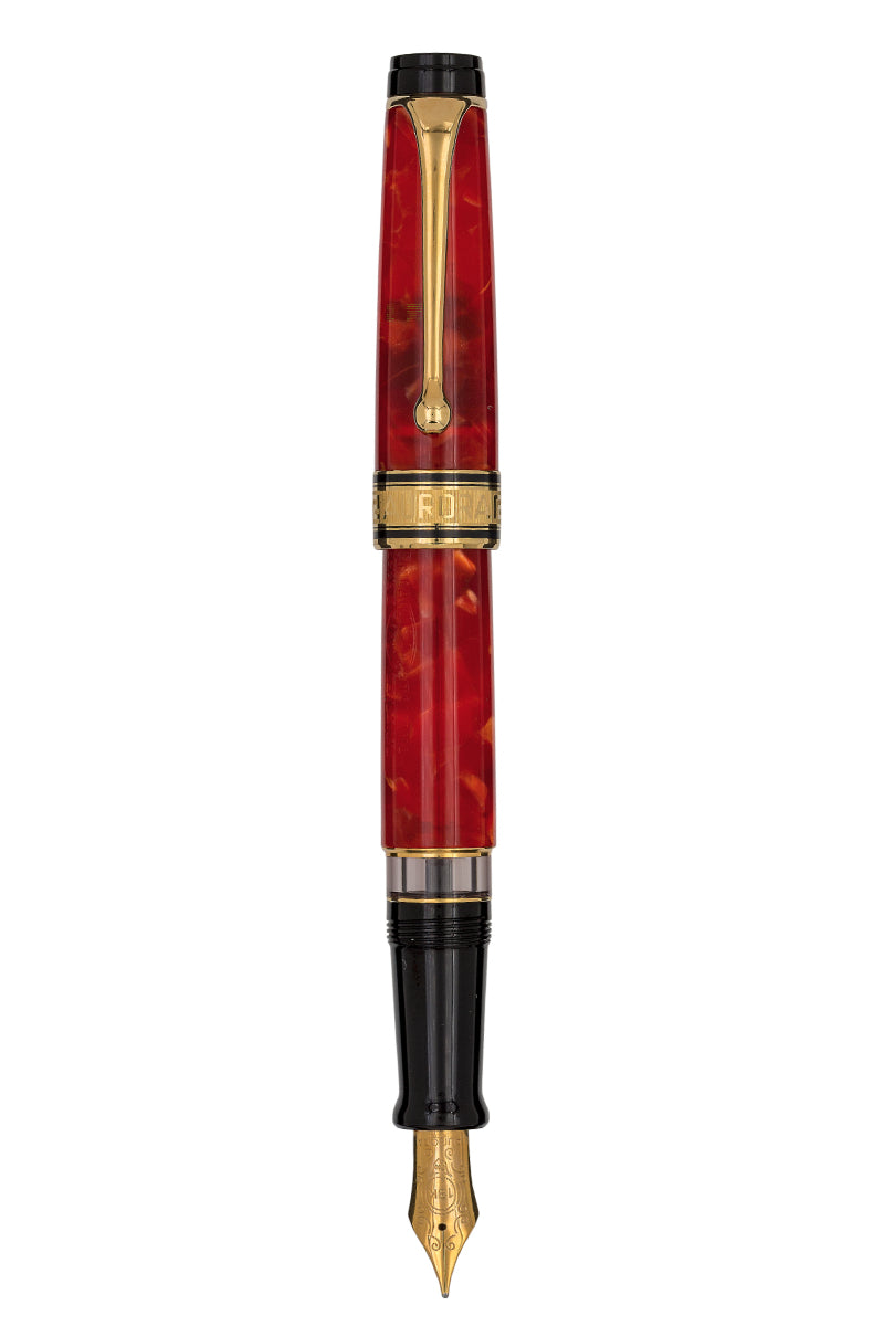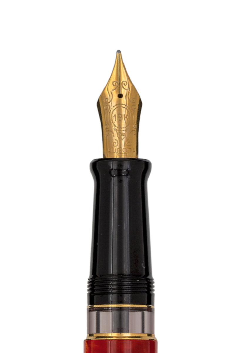 Optima 365 Coral Red viene con un plumín de oro sólido de 18 kt. cada plumilla Aurora se fabrica internamente junto con la alimentación de ebonita que permite un flujo de tinta constante y moderado. Optima presenta el diseño único de relleno de pistón de Aurora con una reserva de tinta incorporada. Cuando la pluma se seque, extienda el pistón para tener acceso a la tinta suficiente para varias páginas más de escritura. La perilla del pistón permanecerá extendida actuando como un recordatorio para rellenar la pluma mientras aún permite que se coloque la tapa.