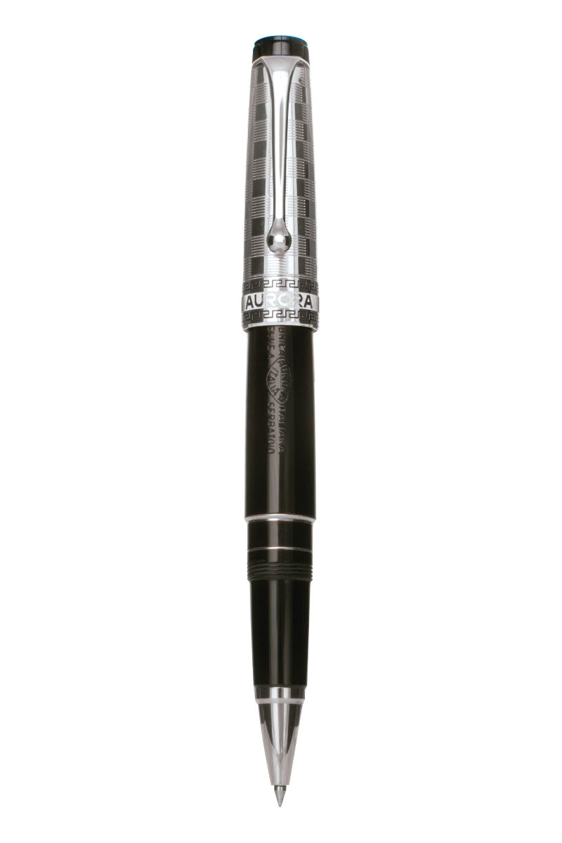 Aurora Decò, combina sus modelos con una brillante resina negra que hace del capuchón el principal protagonista: cuadrícula grabada en guillochè, realizado en tres materiales diferentes: Plata esterlina, oro macizo de 18Kt y oro rosa de 18 Kt.