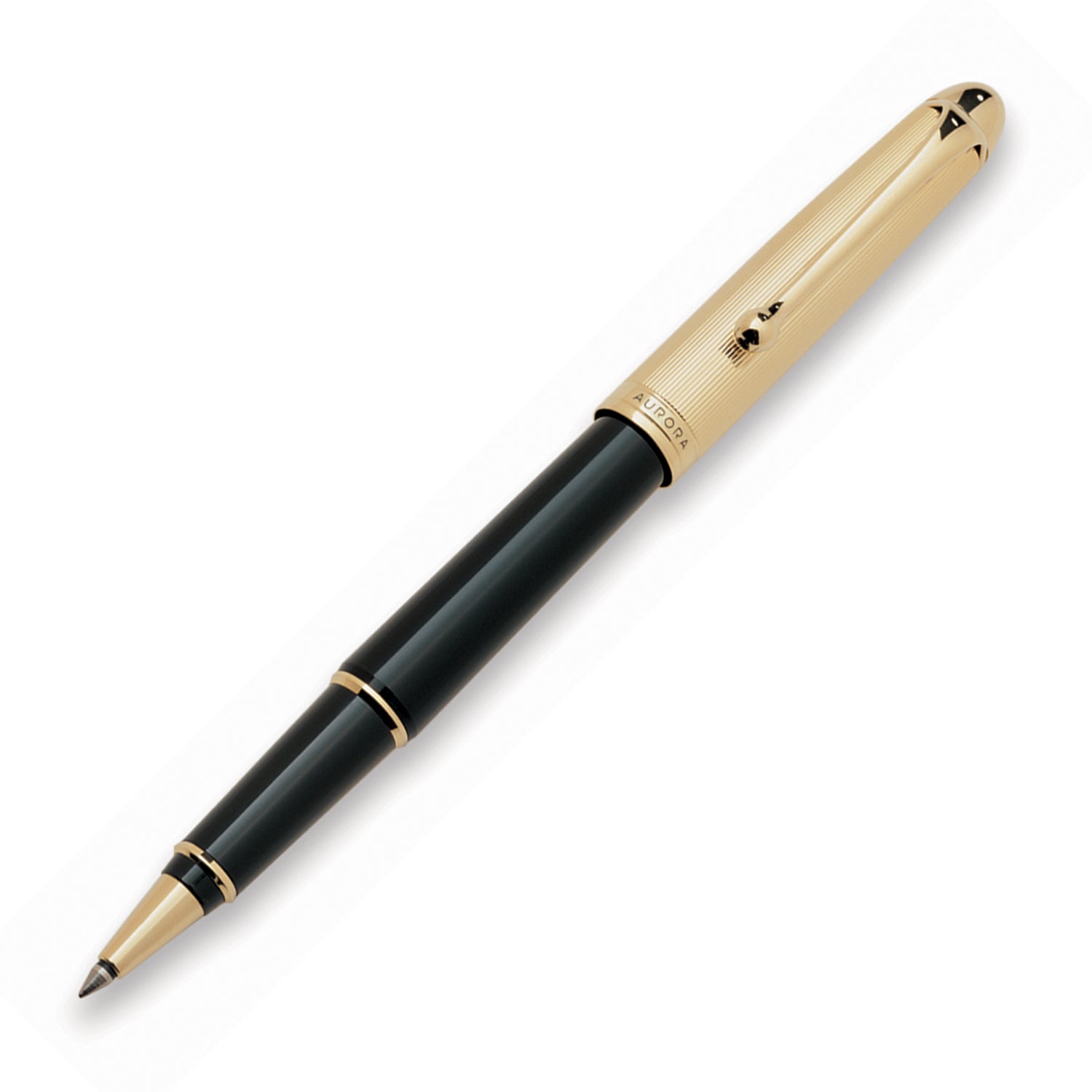 Ottantotto cuenta con un capuchón laminado chapado en oro, grabado con un guillochè lineal, cuerpo en resina negra y detalles dorados.