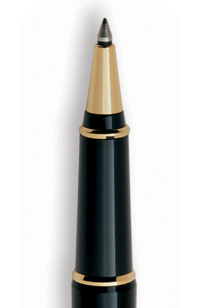 El capuchón del rollerball Ottantotto está elaborado en plata, con un grabado tipo guillochè lineal, cuerpo en resina negra y detalles dorados.
