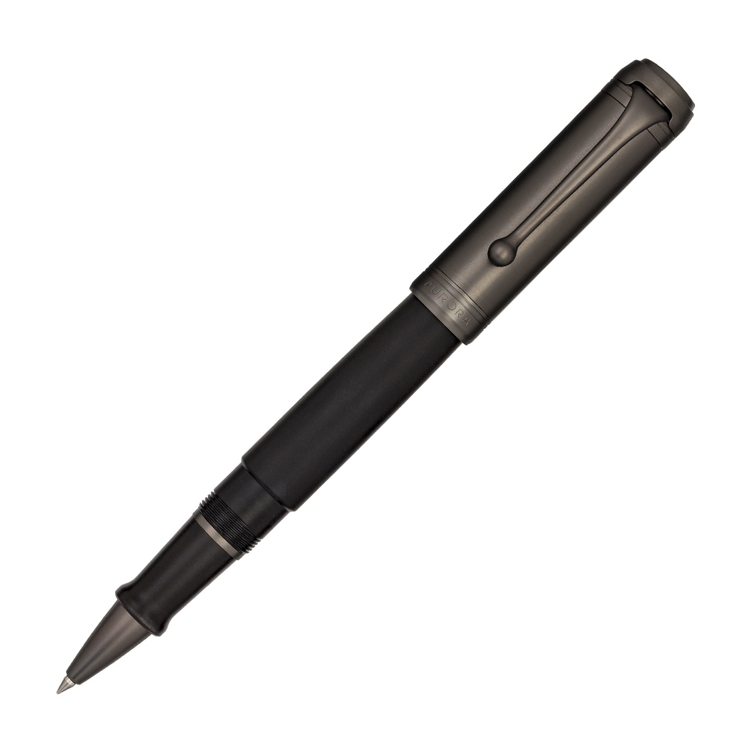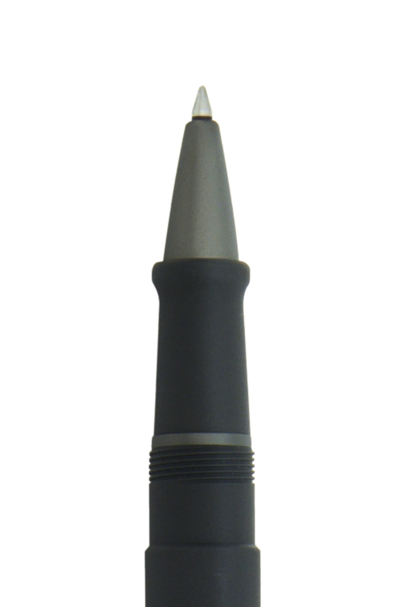 Roller con tapa en rutenio satinado y cuerpo en resina negra satinada; adornos de rutenio satinado.