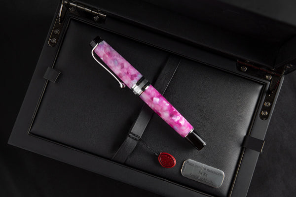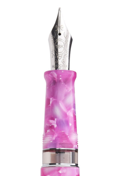 Pluma estilográfica en Auroloide marmoleado rosa y blanco. Plumín de oro macizo de 18 kt, tratado con rodio. Adornos cromados. Edición limitada a solo 860 piezas y bolígrafo limitado a 380 piezas.